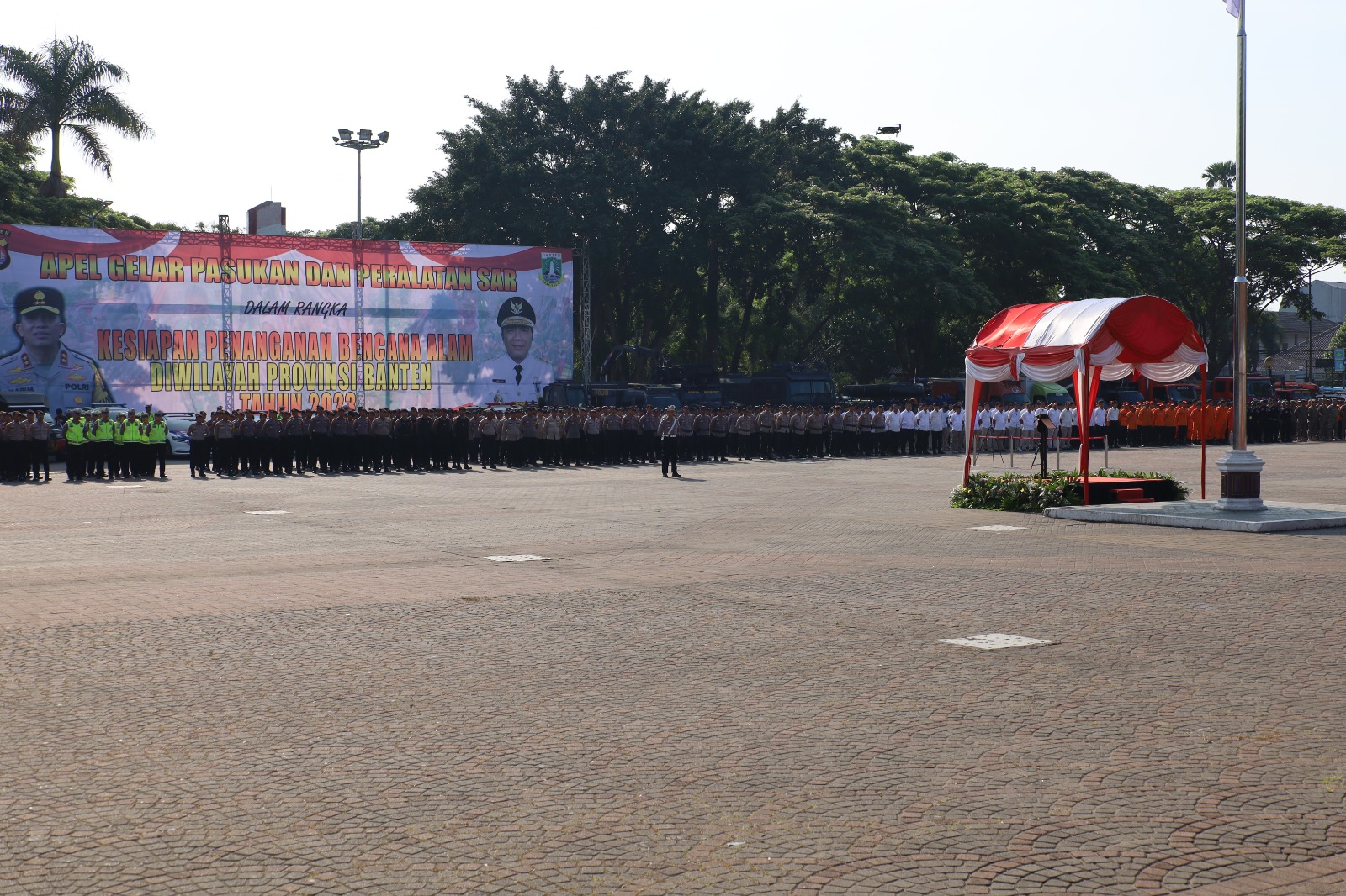 Bertindak selaku pimpinan apel Pj Gubernur Banten Al Muktabar diikuti oleh personel TNI/Polri, Satpol PP, Dinas Perhubungan, Basarnas, BPBD, Tagana, dan PMI tersebut diadakan di Alun-alun Barat Kota Serang pada Selasa (19/12).