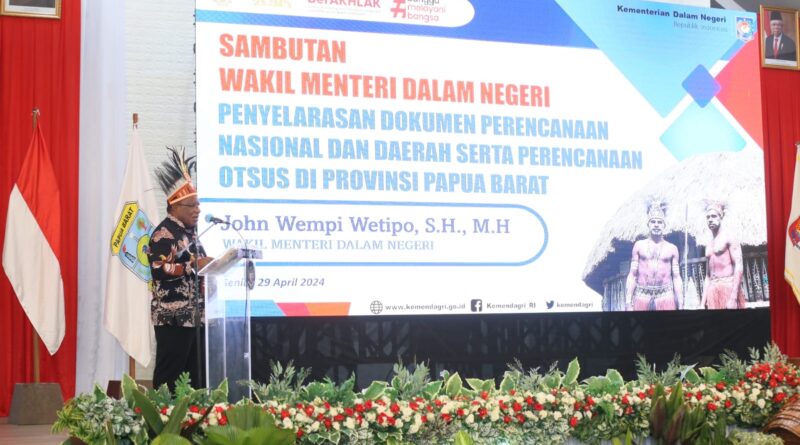 JABAROKE.COM – Manokwari, Wakil Menteri Dalam Negeri (Wamendagri) John Wempi Wetipo mengingatkan Pemerintah Provinsi (Pemprov) Papua Barat agar menyukseskan Pilkada Serentak 2024. Hal ini disampaikan Wempi saat membuka Musyawarah Perencanaan Pembangunan (Musrenbang) Provinsi Papua Barat Tahun 2024 yang berlangsung di Ballroom Meridien Hotel Aston Viu Manokwari, Papua Barat, Senin (29/4/2024).