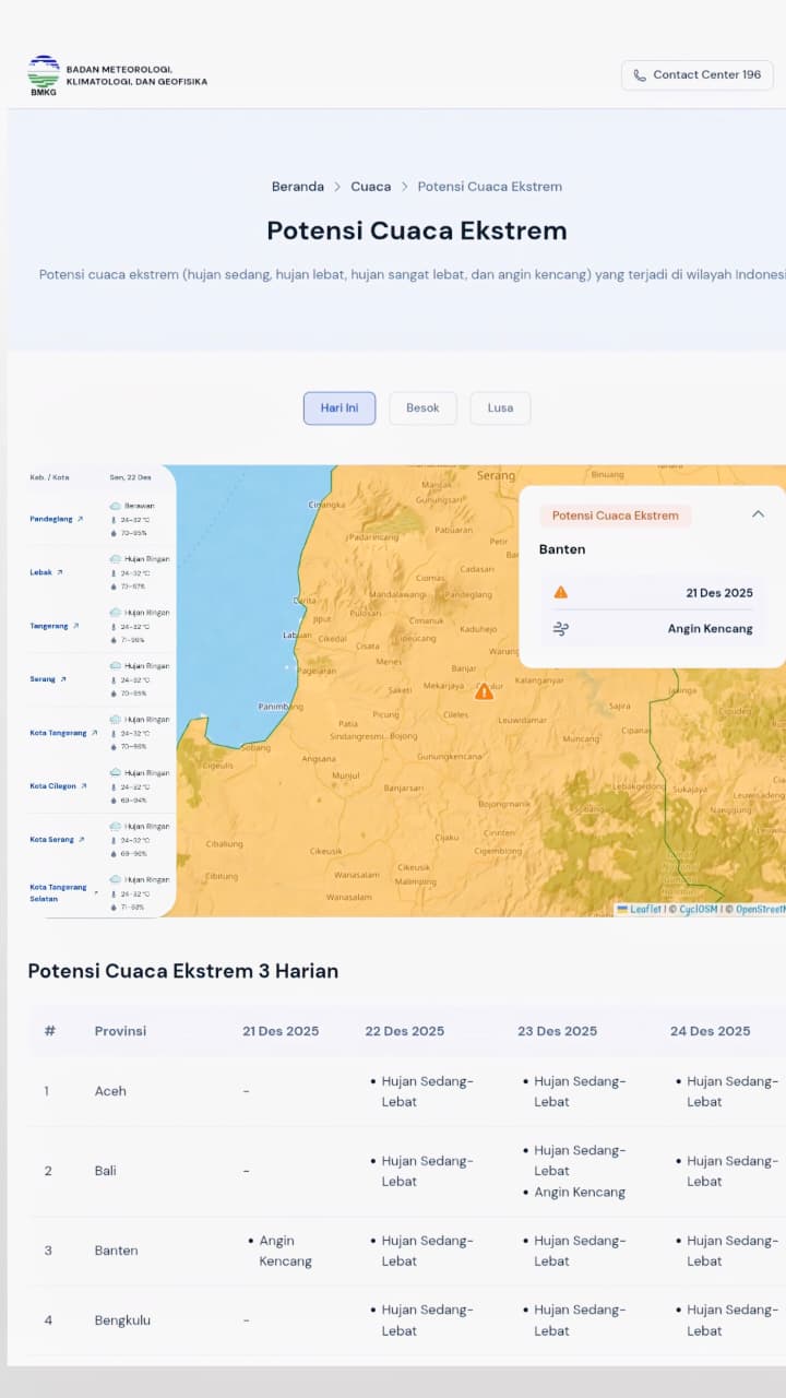 JABAROKENEWS.COM, Serang – Polda Banten kembali mengimbau masyarakat untuk meningkatkan kewaspadaan terhadap potensi cuaca tidak menentu berdasarkan pembaruan informasi dari Badan Meteorologi, Klimatologi, dan Geofisika (BMKG) Banten pada Senin (22/12).