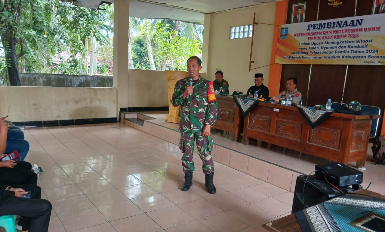 JABAROKE.COM – Serang, Menjaga keamanan dan terciptanya kondisi wilayah yang kondusif, Kapten Inf Hariyanto Komandan Koramil (Danramil) 0602-18/Kragilan Kodim 0602/Serang memberikan pemahaman Wawasan Kebangsaan (Wasbang) kepada anggota Linmas, materi tentang Sinergisitas TNI-Polri dalam menjaga ketentraman dan ketertiban umum menjelang Pemilu Tahun 2024, bertempat di Aula Kecamatan Kragilan Kabupaten Serang Provinsi Banten, Sabtu (02/12/2023).