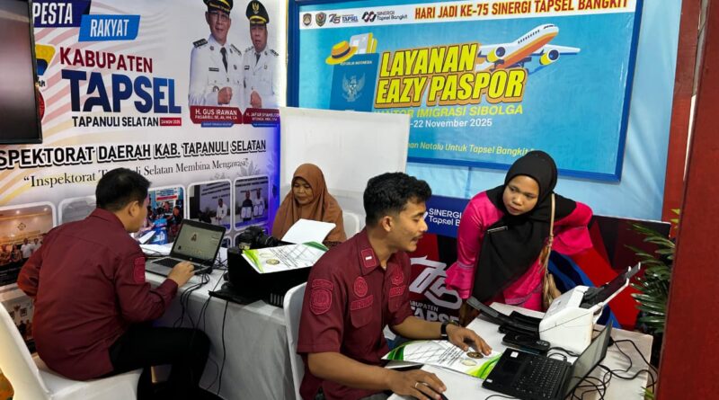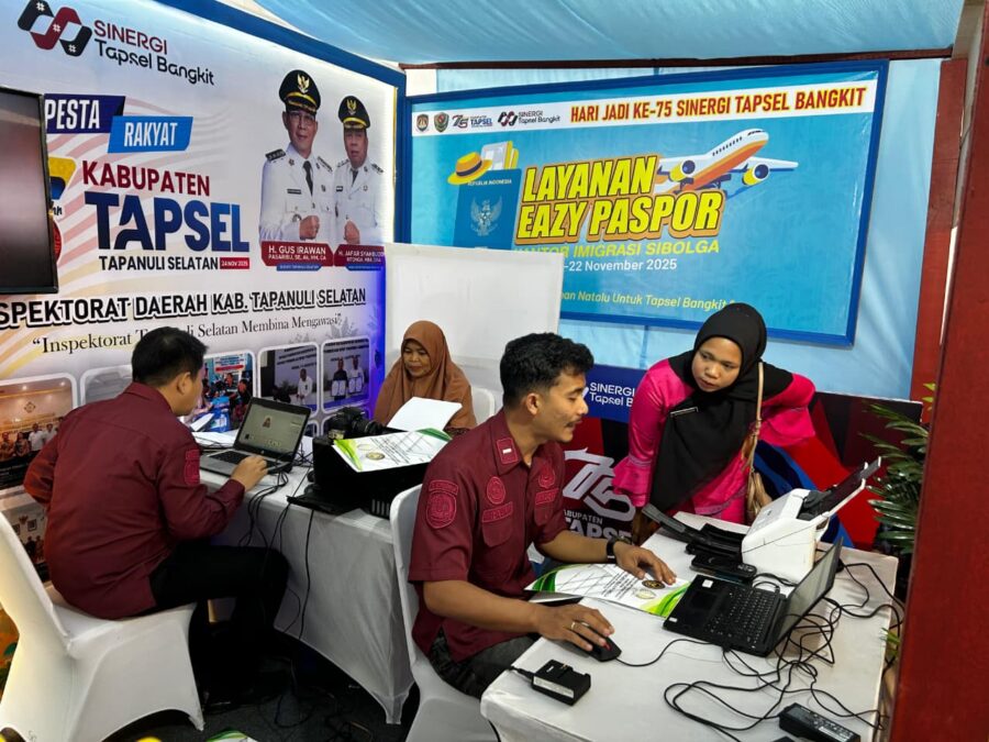 JABAROKENEWS.COM, Sibolga, 22 November 2025 – Kantor Imigrasi Kelas II TPI Sibolga kembali menghadirkan layanan Eazy Paspor dalam rangka memeriahkan Hari Ulang Tahun (HUT) ke-75 Kabupaten Tapanuli Selatan. Kegiatan ini berlangsung selama empat hari, mulai Rabu hingga Sabtu, 19–22 November 2025, di arena Pameran HUT Kabupaten Tapanuki Selatan.