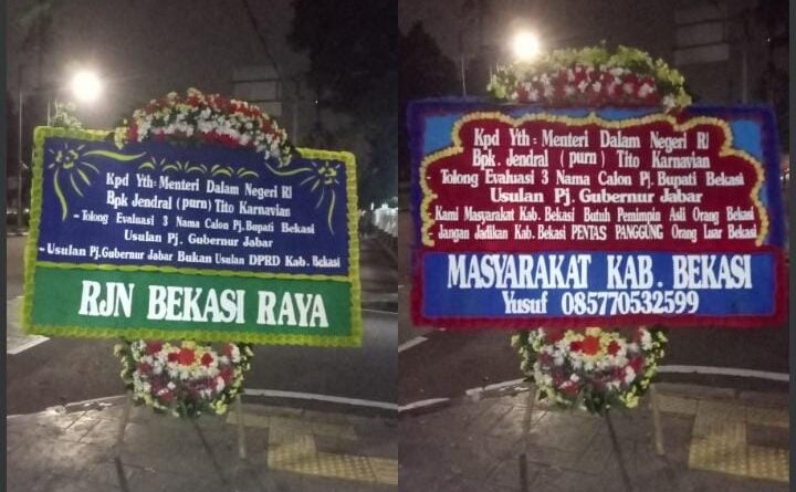 Karangan bunga yang datang bertuliskan kekecewaan atas diusulkannya kembali Dani Ramdan sebagai Penjabat Bupati Bekasi yang sudah melewati batas masa jabatan 2 tahun.
