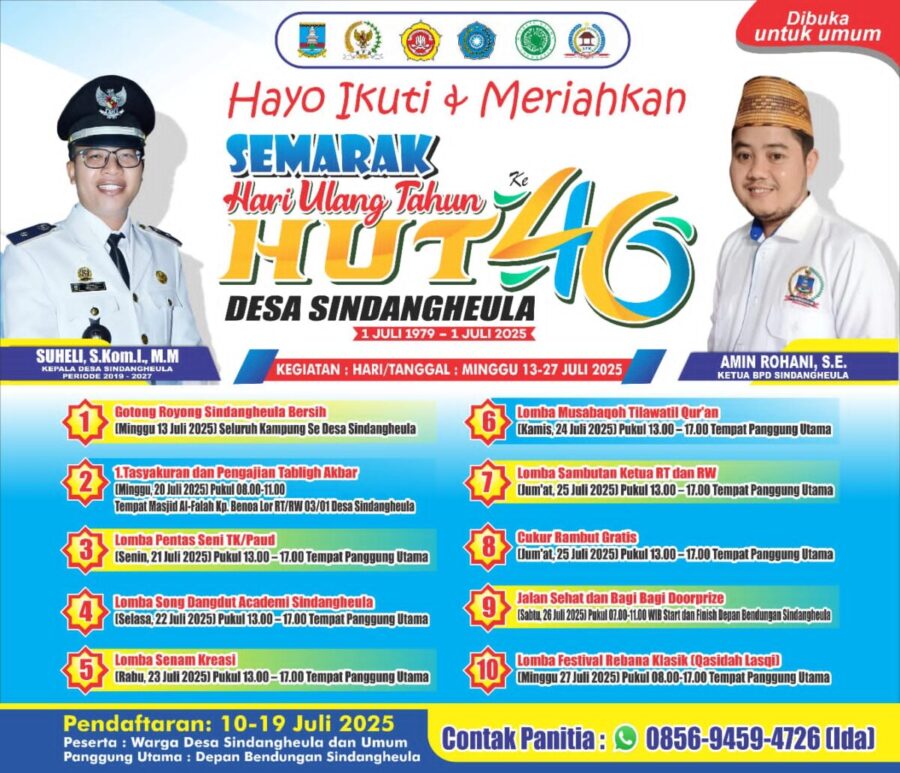 “Bertepatan bulan Juli di tahun 2025 Pemerintah Desa akan mengadakan peringatan HUT Desa Sindangheula ke-46, kegiatan akan melibatkan seluruh warga untuk ikut serta memeriahkan, bahkan untuk umum,” kata Suheli, Rabu (9/7/2025).