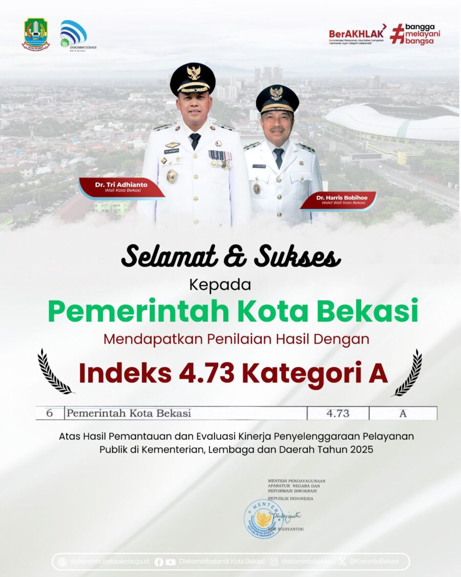 Berdasarkan Keputusan Menteri PANRB Nomor 3 Tahun 2026 yang ditetapkan pada 9 Januari 2026, Pemerintah Kota Bekasi berhasil meraih Indeks Pelayanan Publik sebesar 4.73. Dengan angka tersebut, Kota Bekasi masuk dalam Kategori A (Pelayanan Prima), yang merupakan peringkat tertinggi dalam evaluasi tersebut.