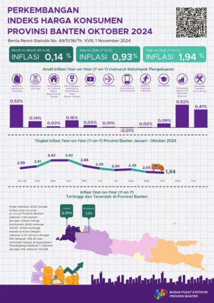 JABAROKENEWS.COM, Banten – Berdasarkan Berita Resmi Statistik Badan Pusat Statistik Provinsi Banten, Jumat (1/11/2024) yang dipaparkan oleh Kepala BPS Provinsi Banten Faizal Anwar, pada Oktober 2024 terjadi inflasi year on year (y-on-y) sebesar 1,94 persen dengan Indeks Harga Konsumen (IHK) sebesar 105,61. Inflasi bulan ke bulan (m-to-m) sebesar 0,14 persen, dan inflasi tahun kalender (year to date/ y-to-d) sebesar 0,93 persen.