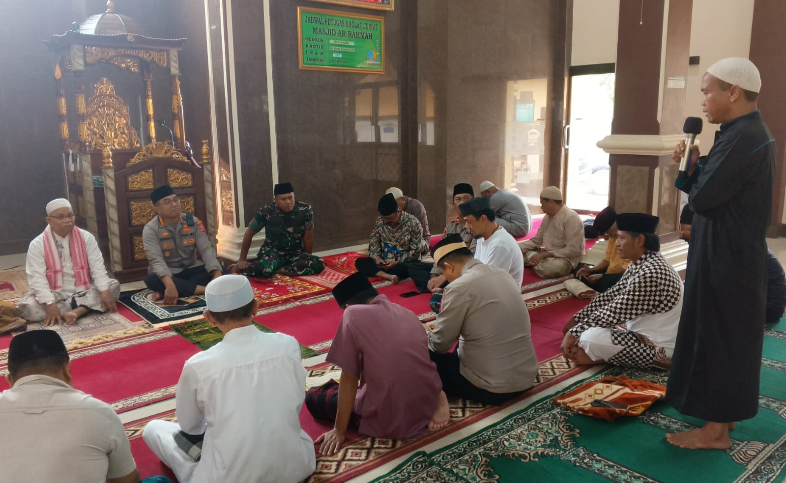 JABAROKE.COM – Kota Serang, Komandan Kodim (Dandim) 0602/Serang Letnan Kolonel Inf Mulyo Junaidi, S.E., M.Tr (Han) Bersama Kapolresta Serang Kombes Pol Sofwan Hermanto, S.I.K., M.H.,M.I.K , melaksanakan kegiatan Jum’at keliling untuk menyampaikan pesan tentang pentingnya menjaga Keamanan dan Ketertiban Masyarakat (Kamtibmas), bertempat di Masjid Ar – Rahman Lingkungan Griya Permata Asri Kelurahan Dalung, Kecamatan Cipocok Jaya Kabupaten Serang Provinsi Banten, Jum’at (01/12/2023).