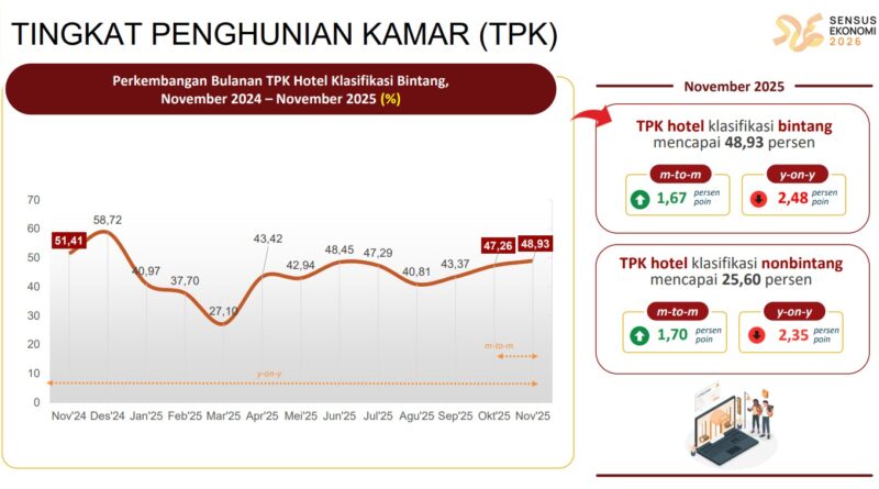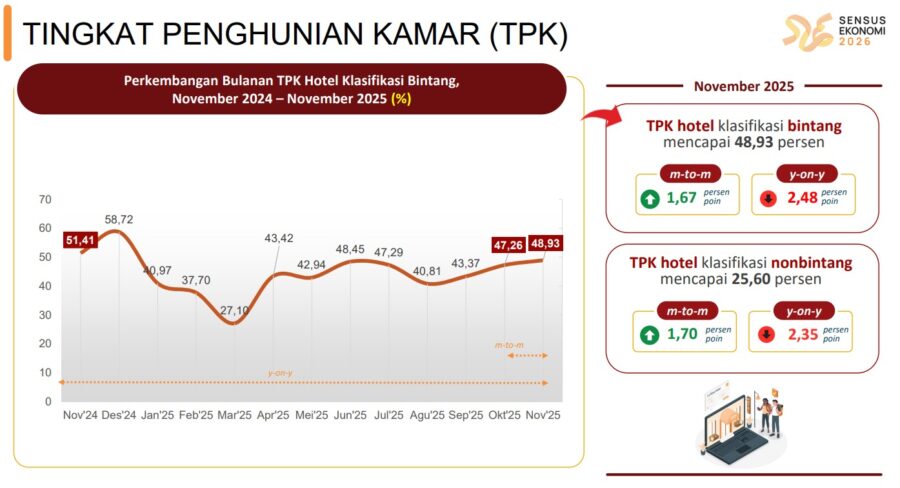 Bahkan pada segmen hotel kelas atas, tekanan terlihat lebih nyata. Pada November 2025, hotel bintang lima secara nasional hanya mencatat TPK sekitar 56,30 persen, mengalami penurunan secara tahunan dan menjadi segmen dengan koreksi terdalam dibandingkan klasifikasi hotel lainnya.