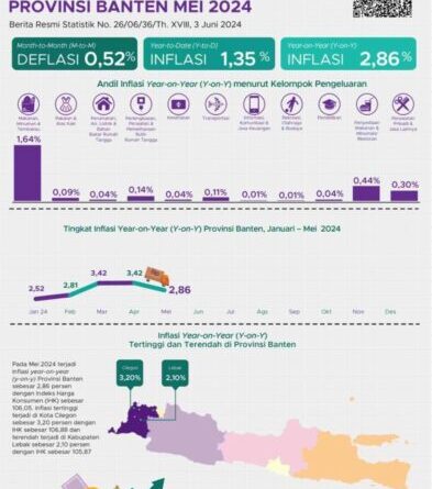 JABAROKE.COM – Banten, Berdasarkan Berita Resmi Statistik No. 26/06/36/Th. XVIII, 3 Juni 2024 Badan Pusat Statistik (BPS) Provinsi Banten, inflasi year on year (y-on-y) Provinsi Banten pada Mei 2024 sebesar 2,86 persen dengan Indeks Harga Konsumen (IHK) sebesar 106,05. Mengalami penurunan dibandingkan bulan April 2024 yang mencapai 3,42 persen.