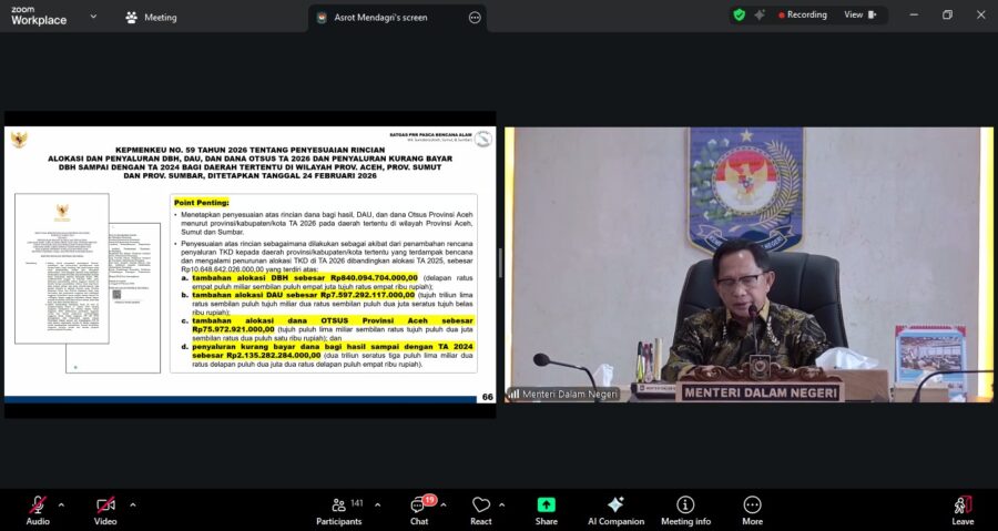 Penjelasan ini disampaikannya pada Sosialisasi Surat Edaran tentang Penyesuaian TKD Tahun Anggaran (TA) 2026 dalam Anggaran Pendapatan dan Belanja Daerah (APBD) bagi daerah terdampak bencana di wilayah Provinsi Aceh, Sumatera Utara (Sumut), dan Sumatera Barat (Sumbar). Kegiatan yang diikuti oleh pemerintah daerah (Pemda) di tiga provinsi terdampak tersebut berlangsung secara virtual dari Kantor Pusat Kementerian Dalam Negeri (Kemendagri), Jakarta, Kamis (5/3/2026).