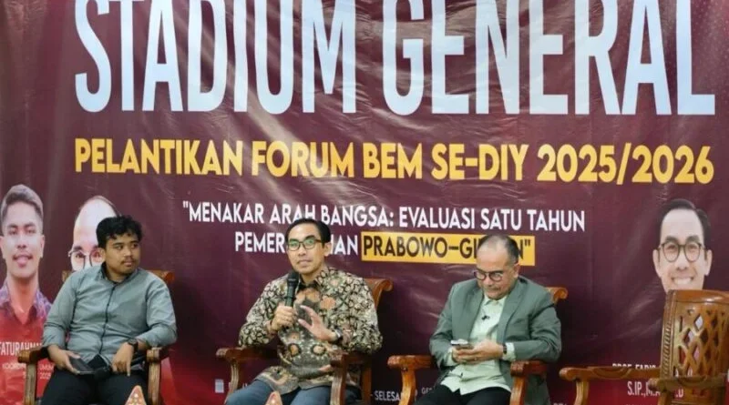 Pandangan tersebut ia sampaikan dalam Stadium General Pelantikan Forum Badan Eksekutif Mahasiswa (BEM) se-DIY periode 2025/2026 bertajuk Menakar Arah Bangsa: Evaluasi Satu Tahun Pemerintah Prabowo-Gibran di Auditorium Universitas ‘Aisyiyah (Unisa) Yogyakarta, Rabu (15/10) malam.