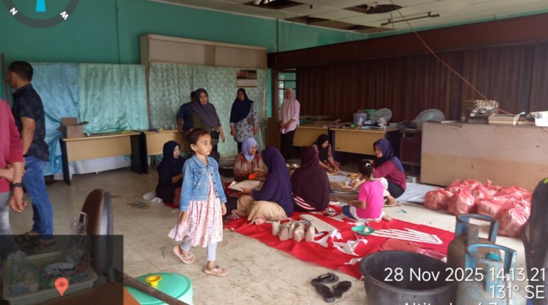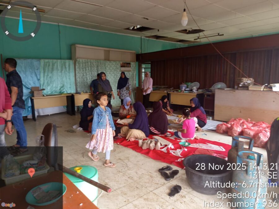 “Air sudah masuk sampai ke dapur, kami tidak bisa masak apa-apa lagi. Gas habis, minyak habis,” kata Febri, warga Indra Makmu yang mengungsi bersama keluarganya. “Makanan dari dapur umum ini yang bikin kami bisa makan layak sejak kemarin.”