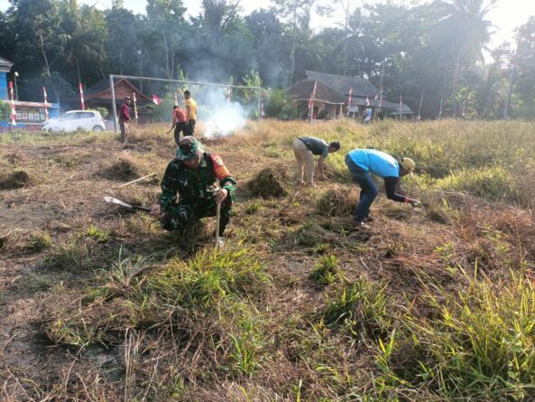 FAJARLAMPUNG.COM – Banten, Anggota Koramil 0109/Munjul, Kodim 0601/Pandeglang bersama masyarakat dan melaksanakan karya bakti membersihkan Lapangan di desa Kadubadak kecamatan Angsana Pandeglang Banten, Senin (21/08/23 )