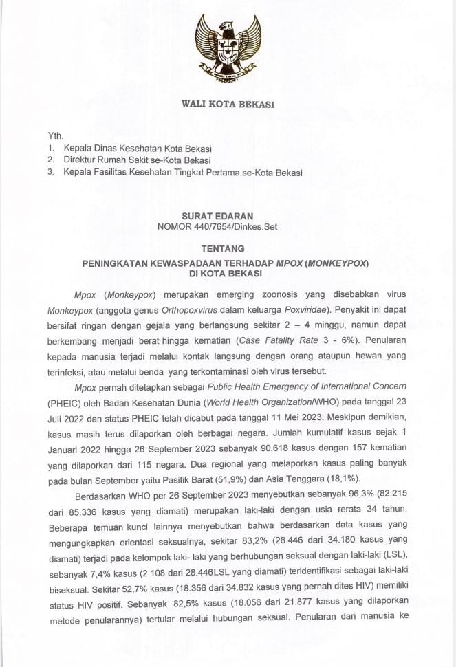 JABAROKE.COM – Bekasi, Pemerintah Kota Bekasi mengeluarkan Surat Edaran Nomor : 440/7654/Dinkes.set tentang peningkatan kewaspadaan terhadap Mpox (monkeypox) di Kota Bekasi.