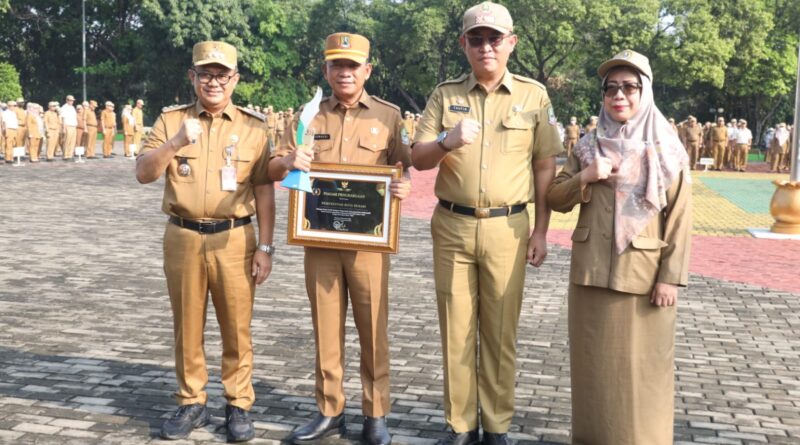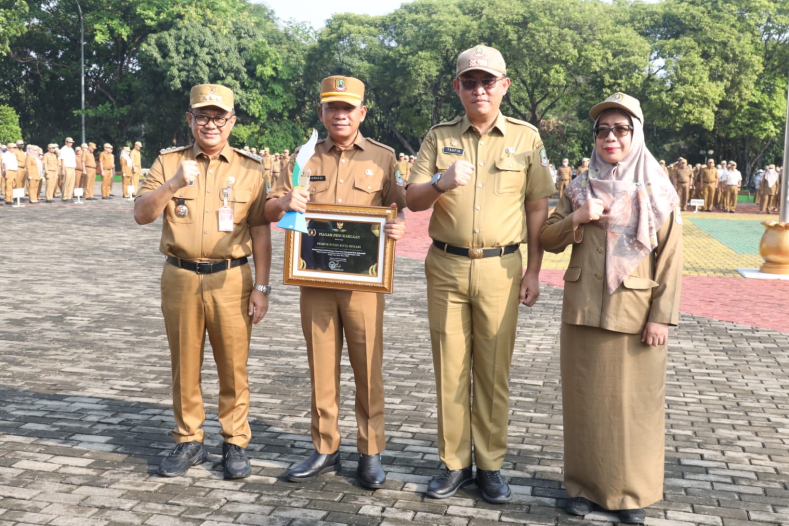 JABAROKE.COM – Bekasi, Pejabat (Pj.) Wali Kota Bekasi, R. Gani Muhamad didampingi Pj. Ketua TP PKK Kota Bekasi, Yolla Kusuma Gani hadir dalam apel rutin untuk menyerahkan beberapa penghargaan atas peraihan dari beberapa perangkat daerah sekaligus menyerahkan penghargaan dari Pemerintah Kota Bekasi kepada masyarakat, Senin 11/12/2023