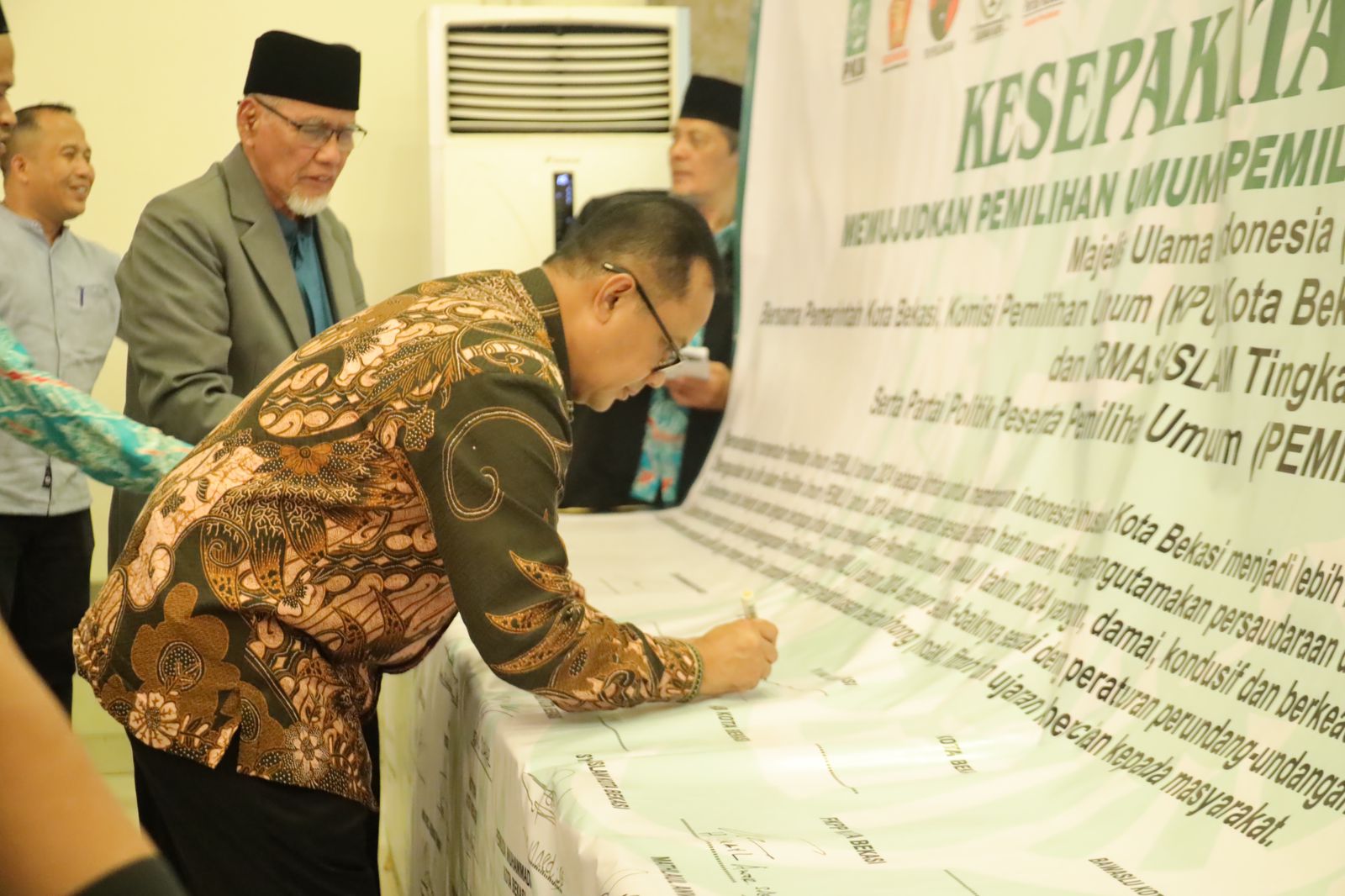 Pj. Wali Kota Bekasi Bersama MUI Tandatangani Kesepakatan Cipta Kondisi Pemilu Berkeadaban