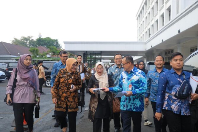 Pj Wali Kota Bekasi didampingi Kepala Dinas Kesehatan Kota Bekasi Tanti Rohilawati, Kepala Bappelitbangda Kota Bekasi Dinar Faizal, Kepala Dinas Pengendalian Penduduk Keluarga Berencana Kota Bekasi Ika Indahyarti.