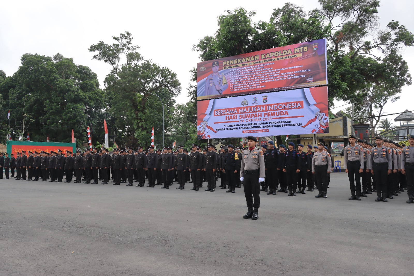 Kapolres Lombok Tengah AKBP Iwan Hidayat, SIK selaku Inspektur Upacara saat peringatan Hari Sumpah Pemuda (HSP) yang juga dirangkaikan dengan pemberian penghargaan kepada Personel yang berprestasi pada saat kegiatan pengamanan Event MotoGP dan Kejurnas Divisi I Livoli di Poltekpar Lombok Tengah.