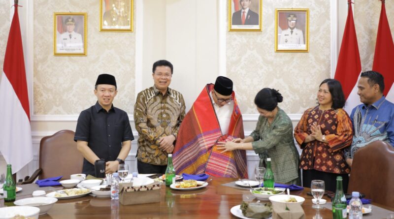 Sebagai bentuk penghormatan dan simbol persaudaraan, Ephorus HKBP menyerahkan ulos kepada Gubernur Mirza.