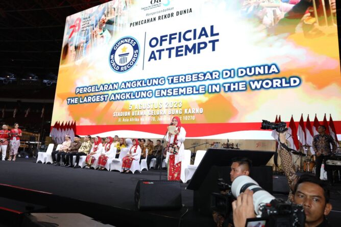 FAJARLAMPUNG.COM – Jakarta, Angklung menjadi warisan budaya tak benda yang perlu dilestarikan khususnya oleh masyarakat Indonesia. Keberhasilan pemecahan rekor dunia pergelaran angklung di Stadion Utama Gelora Bung Karno (GBK), Jakarta, Sabtu (5/8/2023) malam, menjadi momentum melestarikan alat musik tradisional Indonesia.